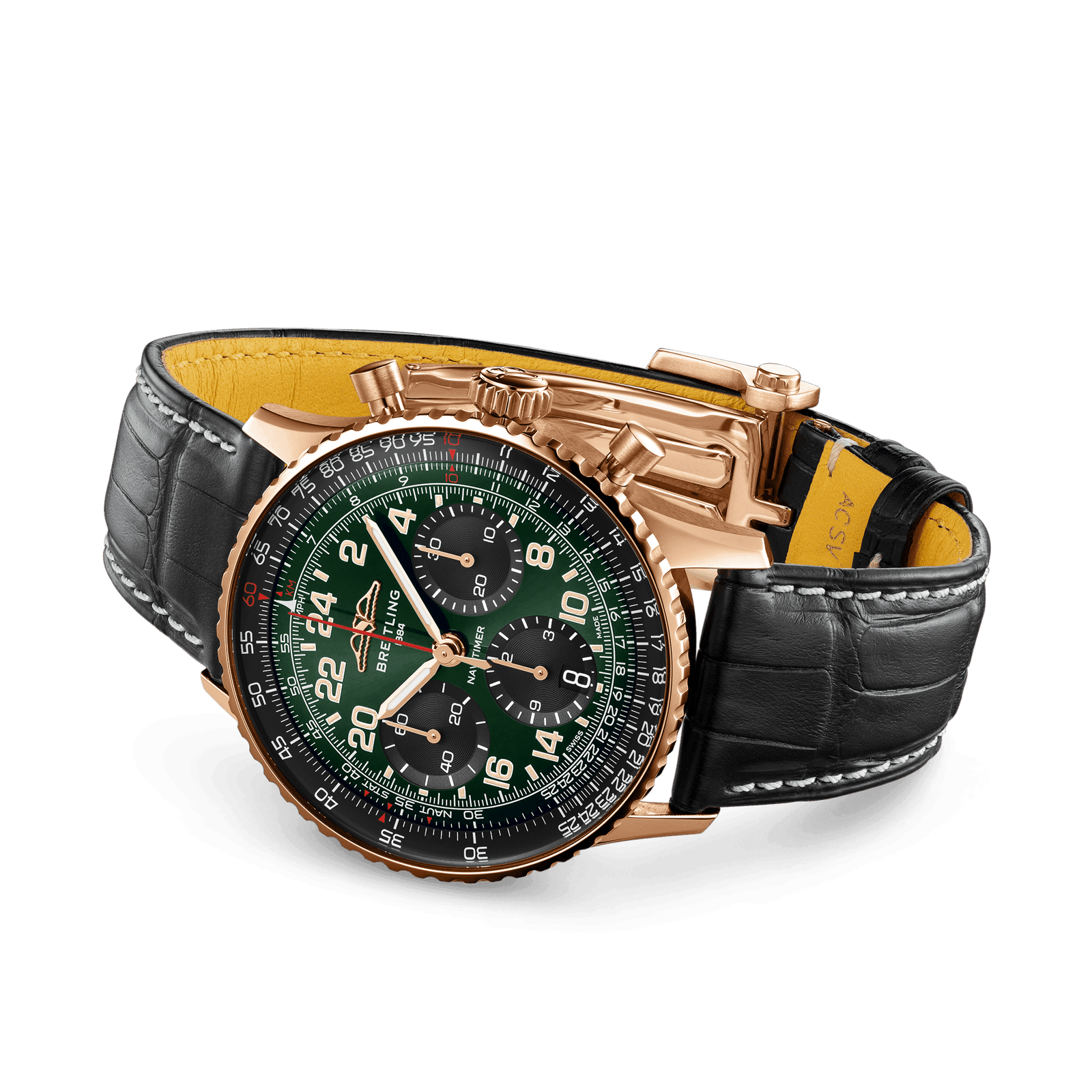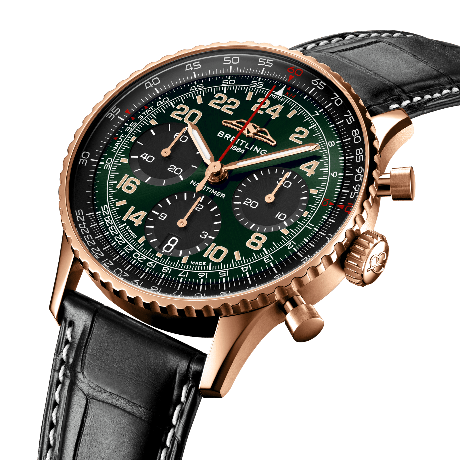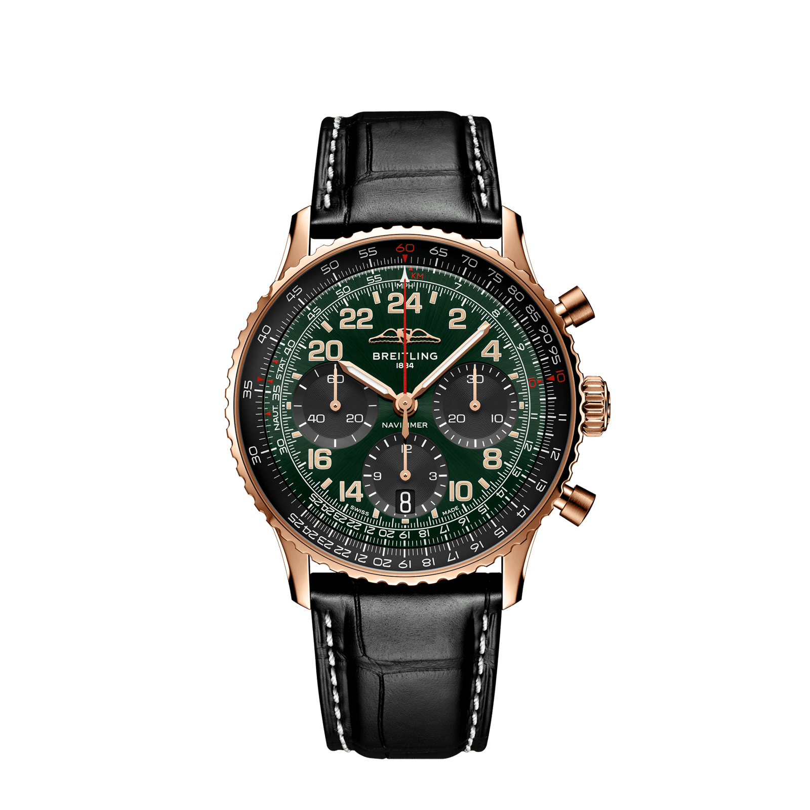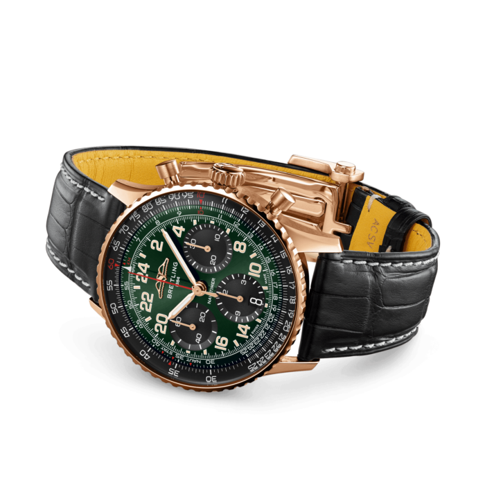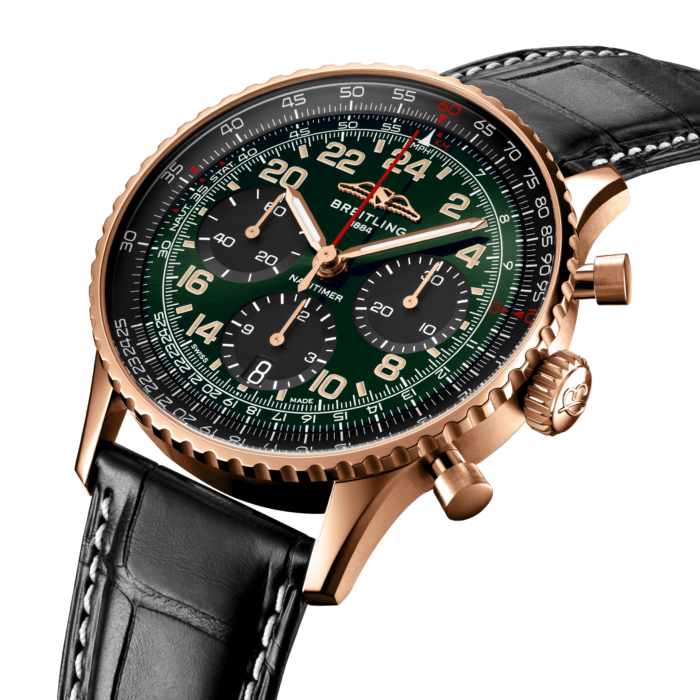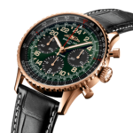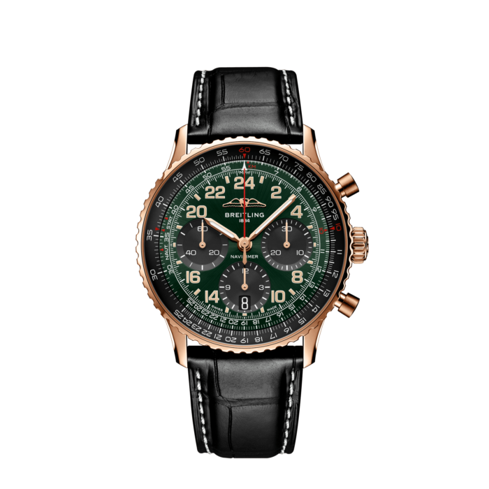 Unworn watch Breitling Navitimer B12 Chronograph 41 Cosmonaute. Reference RB12302A1L1P1 – it’s not just a watch; it is a testament to precision engineering. luxury and timeless elegance. Crafted with meticulous attention to detail. they combine sophistication and functionality. At first glance. the elegant 41mm 18k Red Gold case strikes the eye. striking the perfect balance between classic and modern. The 24-hour Green dial. Rose Gold-colored hour and minute hands with luminous fill. large Arabic numerals as hour markers ensure high readability even in poor visibility. Impressive are the AOPA wings. symbol of the Aircraft Owners and Pilots Association. the largest pilots’ club in the world. which in the 1950s chose the Navitimer as its official watch at 12 o’clock. The intricate workings of the watch are demonstrated by a chronograph. which includes the elegant red central second hand; black sub-dial for 30-minute counter at 3 o’clock; black 12-hour counter subdial at 6 o’clock. While the iconic circular slide rule adds. a touch of aviation heritage. The watch also has a second’s subdial at 9 o’clock and a date indicator at 6 o’clock. The dial is covered with a domed scratch-resistant sapphire crystal with anti-reflective coating on both sides. The transparent sapphire crystal case back reveals the mesmerizing operation of the movement. The dial is framed by a signature bi-directional fluted 18k Red Gold bezel with a scalloped profile for easy grip. A masterpiece of engineering. Breitling’s in-house Caliber 12 contains 47 jewels and has an approximate power reserve of 70 hours. ensuring exceptional precision. allowing you to conquer every moment with unwavering precision. The watch presented on the Black Alligator leather strap with 18k Red Gold l Folding Clasp. The water resistance is up to 30m/99ft (3 ATM).