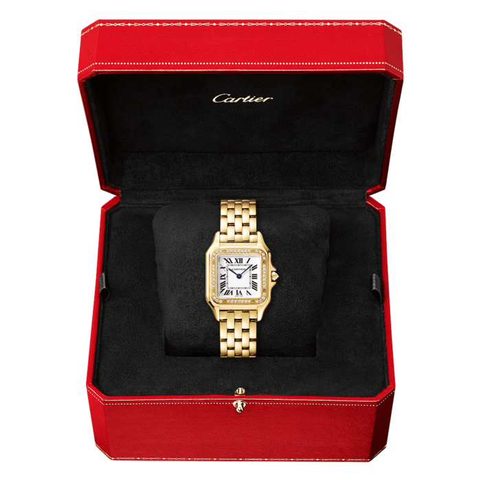 Cartier Panth??re de Cartier Medium 18ct Yellow Gold Diamond Set Watch WJPN0016. 18ct yellow gold 36.5mm x 26.7mm case and diamond set bezel all on a 18ct yellow gold bezel. This ladies watch Features a white dial with blued hands and black roman numerals. Water resistant up to 30m and sapphire crystal glass. Quartz movement.