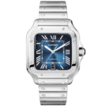 This Santos de Cartier watch protects the movement inside a 100-meter water resistant case and Features a seven-sided crown with a synthetic blue spinel at its tip. The stainless steel bracelet of the men’s Santos de Cartier watch is integrated with the company’s QuickSwitch technology. A second strap in navy blue calfskin with a steel double adjustment buckle provides a smart alternative to pair with elegant evening attire. The dial of this Cartier Santos watch is protected by an anti reflective and scratch resistant sapphire crystal glass lens and Features a black date aperture at 6 o’clock.??